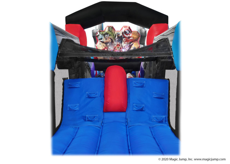 A 50-foot-long superhero-themed obstacle course featuring bounce zones, character pop-ups,